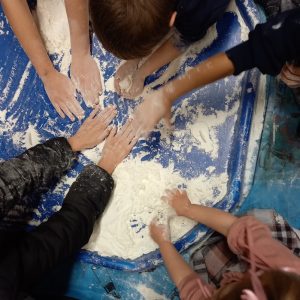 Snow? There is sometimes snow but not today, so we had some ‘play snow’ instead! Very messy!